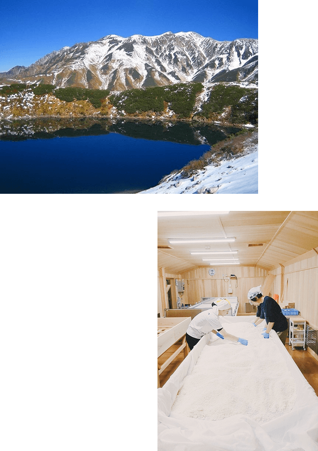 At the heart of Ichinoya’s sake-making is the pristine underground water that flows from the 3,000-meter-class peaks of the Northern Japanese Alps. Filtered and refined over many years, this natural spring water varies in mineral content from ultra-soft to medium-hard—something rare among brewing regions. By choosing the optimal water type for each sake label, Ichinoya creates distinctive flavors unique to “Shinano-Omachi, the Town Where Waters Are Born.”