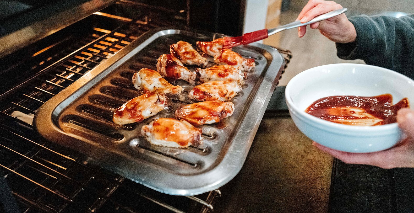 Next, using a cooking brush, coat the baked chicken wings with your preferred BBQ sauce and return them to the oven for an additional 1-2 minutes until the sauce is nicely caramelized. While caramelizing the sauce, flip the wings again to ensure the even finish. (Note: This step takes place very quickly. Please be extra careful as it is easy to burn the wings after applying the BBQ sauce.)